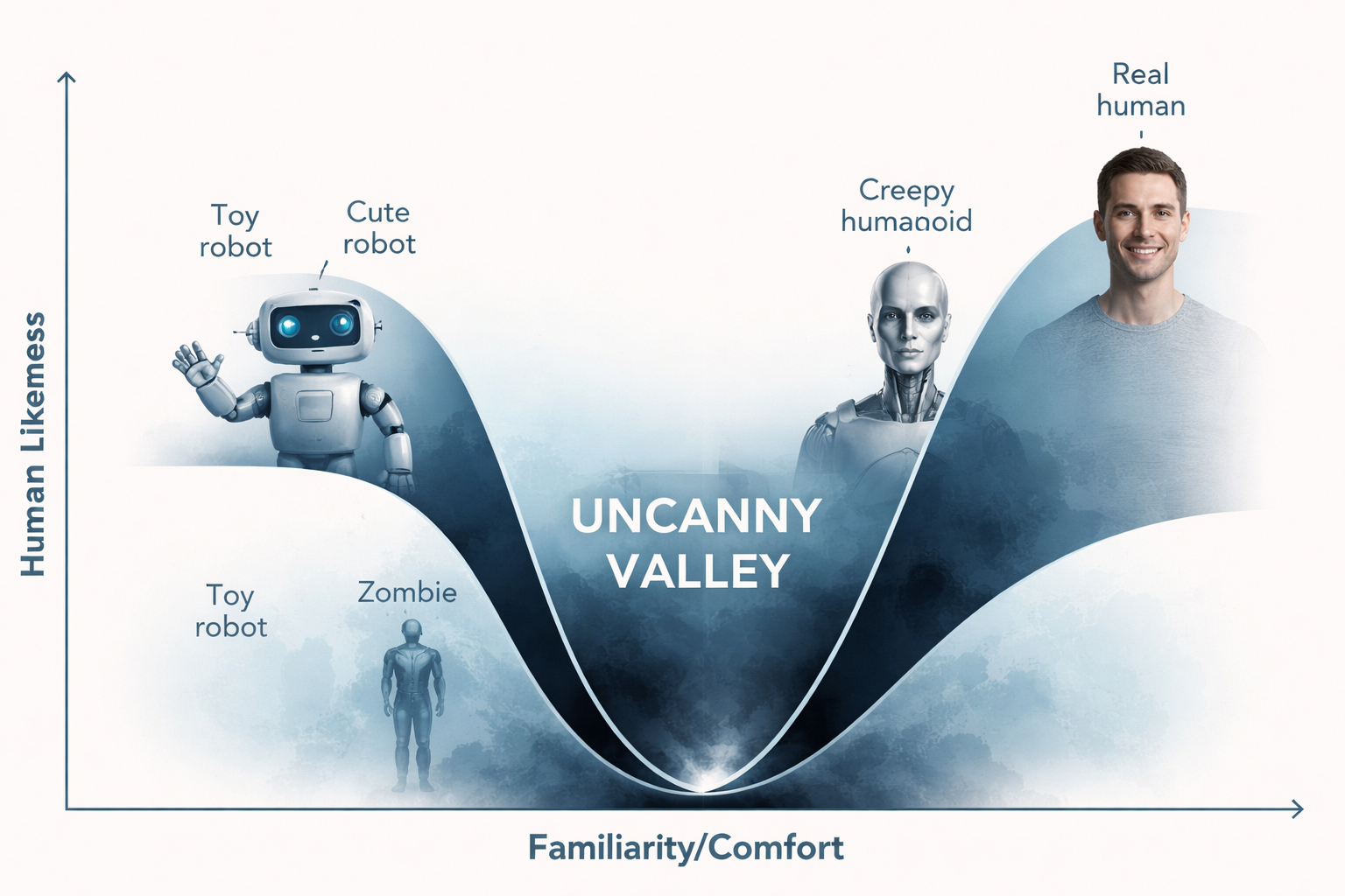 But once we hit that tipping point - when something is so close to human, yet we know in our bones it’s not - we plummet into the uncanny valley. And with it comes an instinctive urge to pull away.